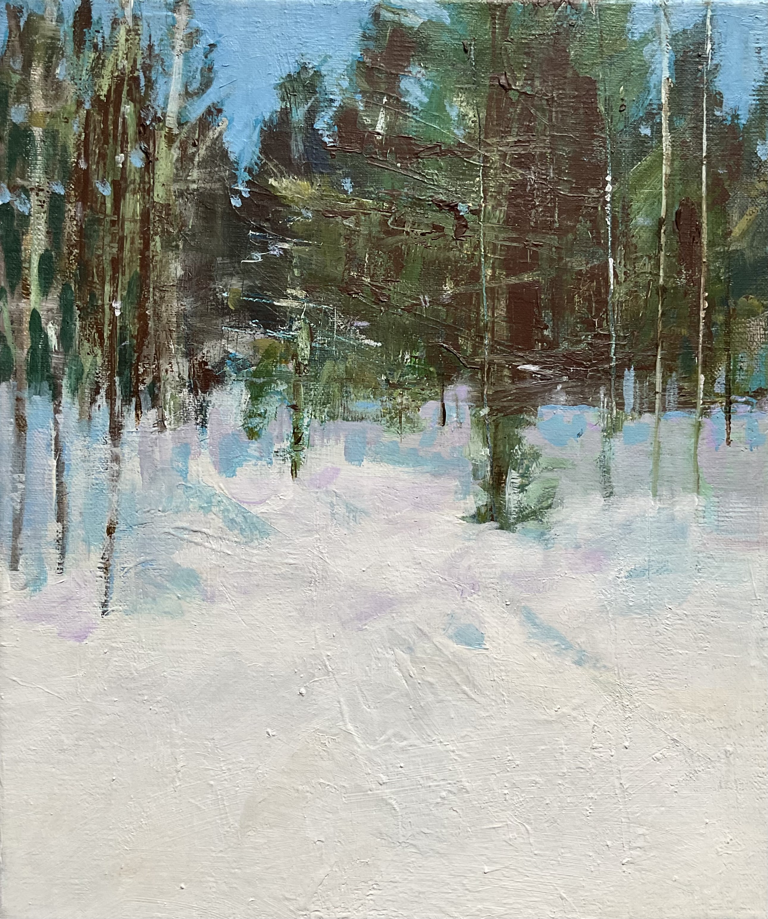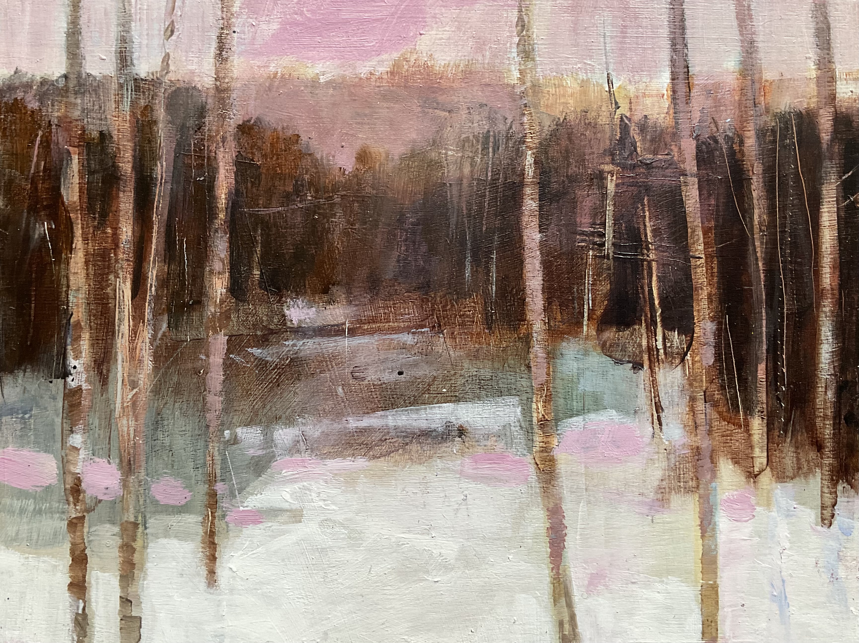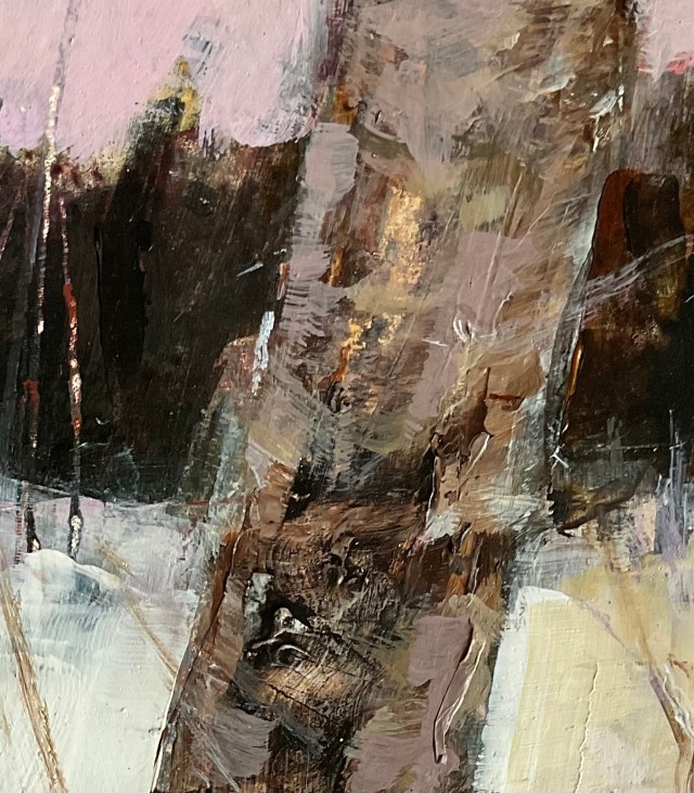 The wintry subject came about through reading winter haiku before and during the painting process. This was long before we saw the first snow fall! The representational aspect of the work seemed to emerge naturally. I frequently find that it is only once I have made such images that I can then begin the process of abstraction, and even then only if there is something I need to investigate further. Painting is a mysterious activity!