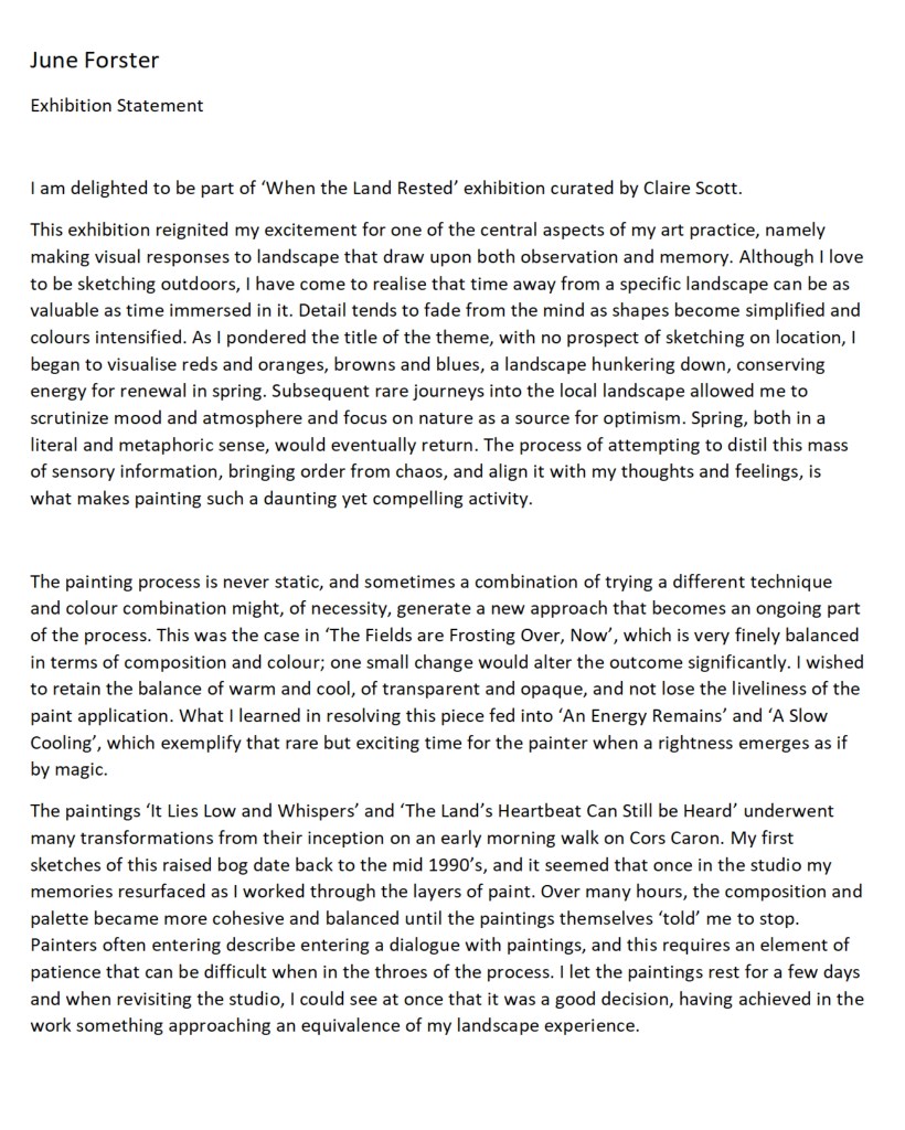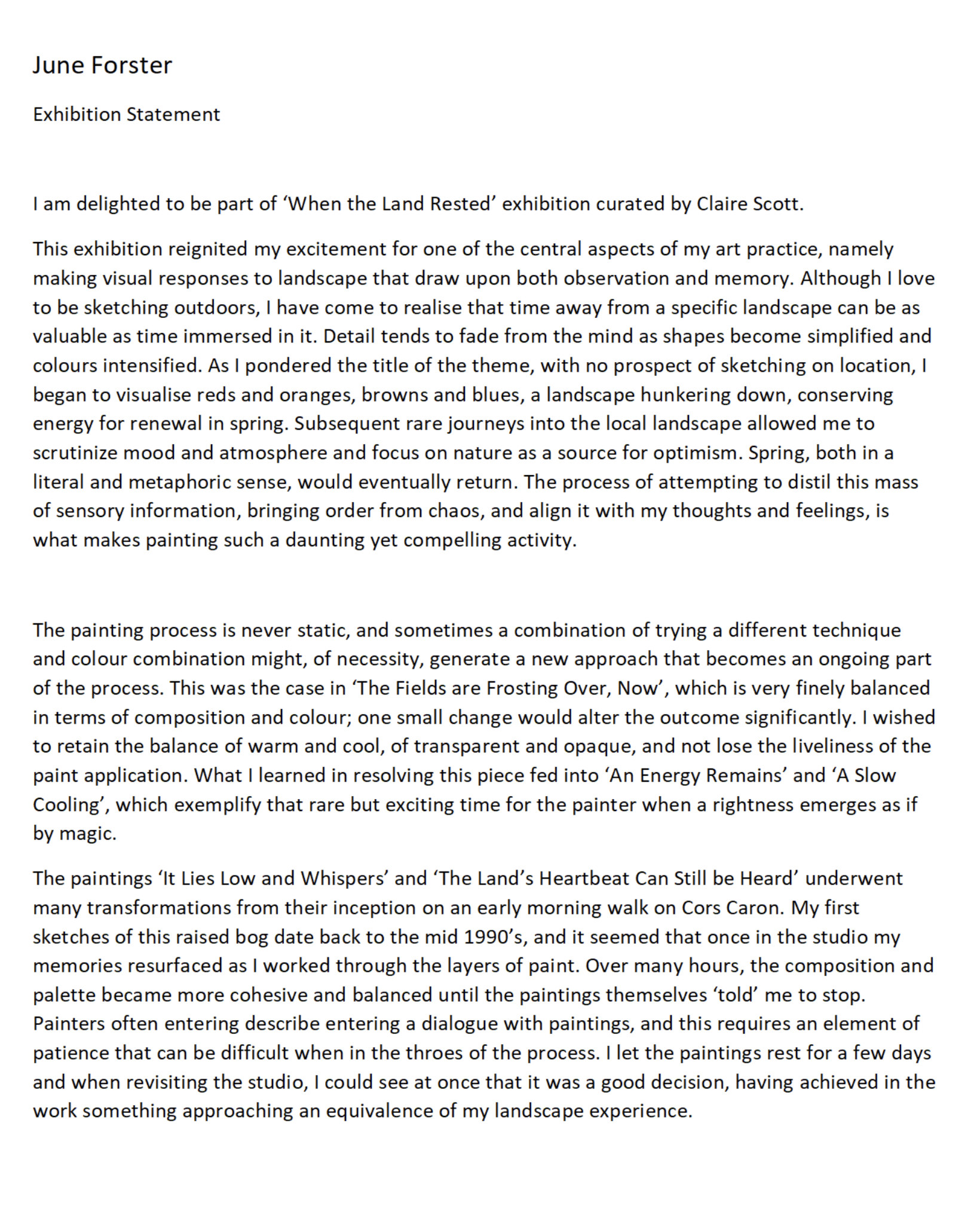 Delighted to be part of this group show ‘When the Land Rested’ curated by Claire Scott. A superbly hung exhibition that highlights correspondences between the various artworks by Dennis Farrell, Alysia Webster, Mick Manning, Claire Scott and June Forster. Read my full exhibition statement below.