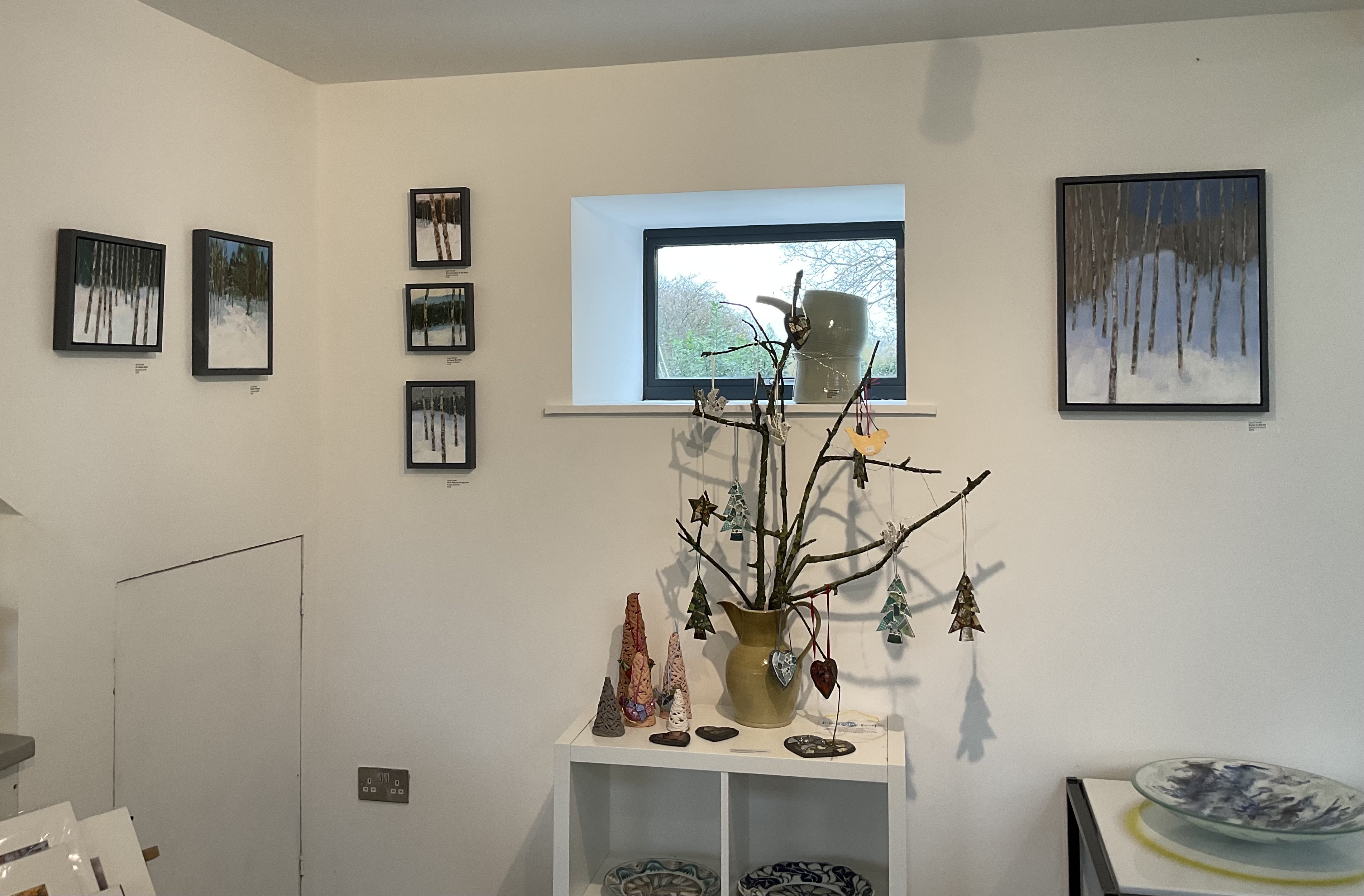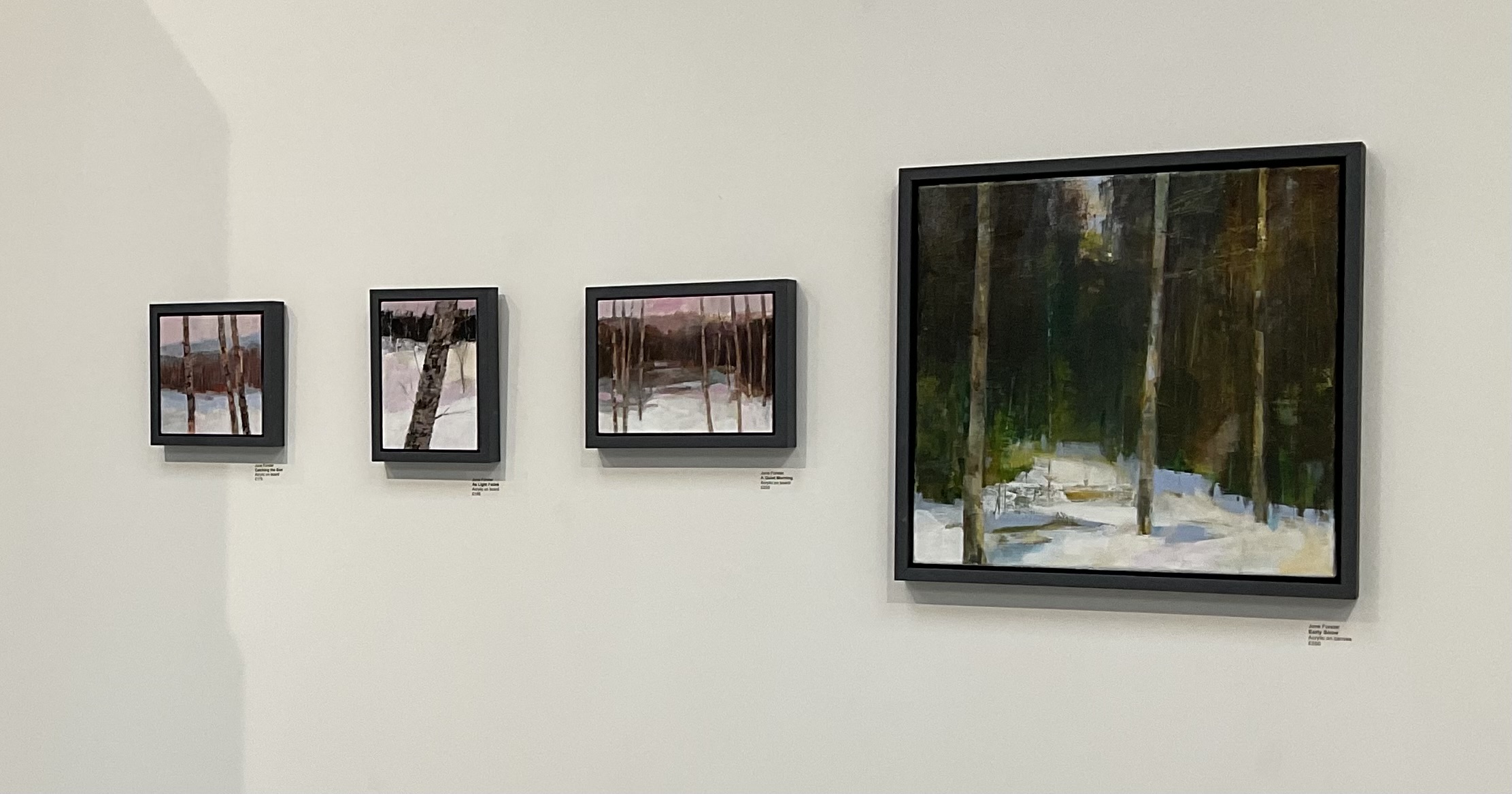 I was pleased to show several paintings at MWA, Caersws. These came about following a period of reading haiku. Possibly thoughts of snowy weather infiltrated my mind as I embarked on the series. Haiku capture the essence of a moment, which makes a painting that is constructed over time somewhat different. However, my aim was to capture something pared back, with a limited palette. In fact, I think of these small paintings as representations of places I would like to be; just the snow, trees and silence!